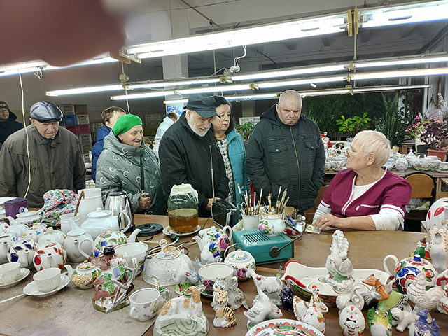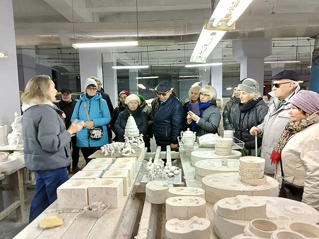 Ближе к концу XIX века было принято решение выпускать массовую продукцию. В советское время фабрика, как и все заводы, была национализирована. Именно на этот период пришёлся расцвет – фабрика стала градообразующим предприятием. Сейчас фабрика снова частная и выпускает, как массовую продукцию, так и эксклюзивные изделия на заказ. Нас провели по цехам. Фарфор производится белой глины (каолина), кварца и полевого шпата. Отличить фарфор от фаянса можно по звуку, также фарфор частично пропускает свет. Сначала всё поступает на мельницу, расположенную под полом одного из цехов. Затем смесь нарезается на овальные бруски. После чего, в зависимости, от технологии изготовления, её путь будет разным: при формовке (эта технология была внедрена на фабрике в советское время), на специальном станке из «лепёшек» делают изделия, которые останется только обжечь. Так производят стандартную посуду: чашки, блюдца и т.п. Для сложных декоративных изделий: как посуды, так и фигурок, используется традиционный способ: смесь заливается в формы. Для каждого элемента: ручек, носиков, деталей фигур и т.д. делается отдельная форма. После всё склеивается. Затем изделия поступают в печь для первичного обжига при температуре 800°C. Нагрев и остывание постепенное. После изделия направляются в живописный цех – на роспись. Затем их покрывают глазурью и подвергают повторному обжигу при температуре 1300°C. Роспись производится исключительно вручную. Чтобы краски не смешивались друг с другом, после нанесения каждого слоя, следует ещё обжиг, снова с 800°C. Число обжигов зависит от количества красок. Другая технология – деколь или переводная картинка. При обжиге краска сплавляется с поверхностью изделия, что делает её максимально устойчивой. После экскурсии мы зашли в магазин при фабрике. Из Вербилок мы поехали на мемориал на Перемиловской высоте – к монументу «Героям битвы под Москвой». Именно здесь началось контрнаступление советских войск. После мы поехали в Дмитров, где обедали в уютном кафе «Бегемот и мышь». Было очень вкусно! Затем нас ждала пешеходная экскурсия по центру города – Дмитровском кремлю. Мы осмотрели скульптуры «Купец с купчихой», «Учительница гимназии», изображающие простых горожан XIX века. Также мы подошли к памятнику П.А. Кропоткину. Кропоткин провёл в Дмитрове свои последние годы. Миновав крепостной вал, мы зашли в Успенский собор. Здание неоднократно перестраивалось, поэтому одна из уникальных керамических икон оказалась в помещении, тогда как остальные остались на внешних стенах. После мы посмотрели Ансамбль присутственных мест, включающий административное здание, тюрьму, флигели и Елизаветинскую церковь, построчную специально для заключённых. Сейчас в этих зданиях располагается музей. Во дворе также есть песочница, в которой проводятся занятия для юных археологов. Рядом находится гимназия «Логос» – одна из старейших в городе. Закончилась экскурсия на площади у памятника Юрию Долгорукому. Это самый центр города. В непосредственной близости от площади – Вечный огонь, а также памятник В.И. Ленину. Недавно исторический центр был реконструирован и теперь стал ещё краше, ещё интереснее! На этом наша программа завершилась. Огромное спасибо всем организаторам этого замечательного тура! Особенно МГО ВОС, лично председателю Мошковскому Александру 