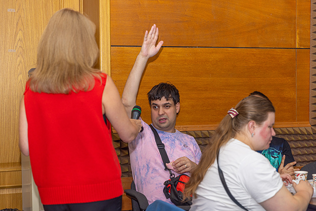 19 сентября 2025 года в рамках молодежного вечера «Московский бит» ведущие специалисты МГО ВОС Конопатова Ольга Викторовна и Колесова Наталья Сергеевна провели образовательно-развлекательный урок о Московской городской организации ВОС. Занятие было посвящено 100-летнему юбилею МГО ВОС и состояло из двух частей: теоретический блок и интеллектуальная викторина. Теоретический блок выключал в себя информацию об исторических вехах создания общества слепых в Москве, социокультурной и физкультурно-оздоровительной реабилитации, работе с ветеранами и молодежью, проводимых мероприятиях, достижениях в сфере развития доступной среды, реализуемых социальных проектах. Наибольший интерес вызвал рассказ о московских производственных предприятиях ВОС. Для ознакомления с их продукцией был установлен стол, где в общем доступе были представлены образцы производимых изделий.