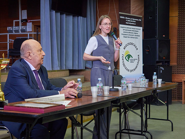 Председатель МГО ВОС Мошковский Александр Николаевич пригласил для награждения Знаком Почета Всероссийского общества слепых Денискину Венеру Закировну. Венера Закировна - тифлопедагог мирового масштаба, за 55 лет своей деятельности выпустила более 260 книг и статей, а также разработала ряд научно-методических пособий по обучению социальной реабилитации и адаптации детей с нарушением зрения.