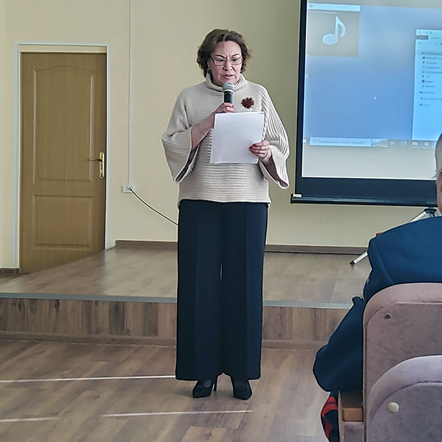 Председатель МО «Академический округ» МГО ВОС познакомила с историей создания и становления Московской городской организации Всероссийского общества слепых её героического прошлого противоречивого настоящего, которая тесно переплетена с историей нашей страны. Рассказала о членах ВОС Московской городской организации ВОС – жителях столицы, которые проявляли самоотверженность на трудовом фронте в годы Великой Отечественной войны.