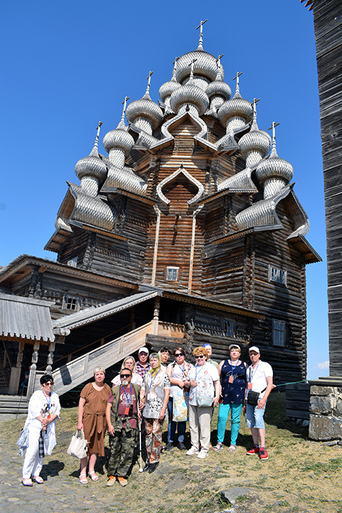 В этот же день нас ждала ещё встреча с островом Кижи. Чтоб добраться до него, мы пустились в плаванье по Онежскому озеру на комете. Все знают, что Кижи – это памятник деревянного зодчества под открытым небом. Однако, энергетику места можно почувствовать только, побывав там. Здесь нас встретил замечательный церковный ансамбль. Мы познакомились с Преображенской церковью – одной из самых больших и сложных деревянных построек в мире. Основной объём представляет восьмиугольник. К нему зодчие поставили четыре прируба, получился крест. Над основным восьмиугольником ещё два, каждый меньше предыдущего и 22 главки-луковки, покрытых чешуйками из осины – трепетицы по-старинному. Сама же церковь из сосны. Красота – необыкновенная!