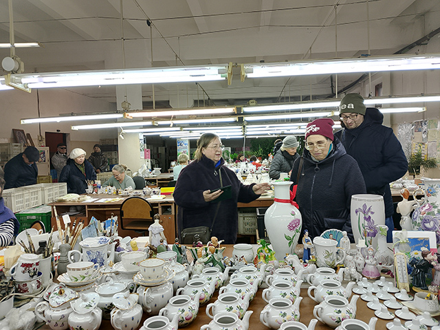 Ближе к концу XIX века было принято решение выпускать массовую продукцию. В советское время фабрика, как и все заводы, была национализирована. Именно на этот период пришёлся расцвет – фабрика стала градообразующим предприятием. Сейчас фабрика снова частная и выпускает, как массовую продукцию, так и эксклюзивные изделия на заказ. Нас провели по цехам. Фарфор производится белой глины (каолина), кварца и полевого шпата. Отличить фарфор от фаянса можно по звуку, также фарфор частично пропускает свет. Сначала всё поступает на мельницу, расположенную под полом одного из цехов. Затем смесь нарезается на овальные бруски. После чего, в зависимости, от технологии изготовления, её путь будет разным: при формовке (эта технология была внедрена на фабрике в советское время), на специальном станке из «лепёшек» делают изделия, которые останется только обжечь. Так производят стандартную посуду: чашки, блюдца и т.п. Для сложных декоративных изделий: как посуды, так и фигурок, используется традиционный способ: смесь заливается в формы. Для каждого элемента: ручек, носиков, деталей фигур и т.д. делается отдельная форма. После всё склеивается. Затем изделия поступают в печь для первичного обжига при температуре 800°C. Нагрев и остывание постепенное. После изделия направляются в живописный цех – на роспись. Затем их покрывают глазурью и подвергают повторному обжигу при температуре 1300°C. Роспись производится исключительно вручную. Чтобы краски не смешивались друг с другом, после нанесения каждого слоя, следует ещё обжиг, снова с 800°C. Число обжигов зависит от количества красок. Другая технология – деколь или переводная картинка. При обжиге краска сплавляется с поверхностью изделия, что делает её максимально устойчивой. После экскурсии мы зашли в магазин при фабрике. Из Вербилок мы поехали на мемориал на Перемиловской высоте – к монументу «Героям битвы под Москвой». Именно здесь началось контрнаступление советских войск. После мы поехали в Дмитров, где обедали в уютном кафе «Бегемот и мышь». Было очень вкусно! Затем нас ждала пешеходная экскурсия по центру города – Дмитровском кремлю. Мы осмотрели скульптуры «Купец с купчихой», «Учительница гимназии», изображающие простых горожан XIX века. Также мы подошли к памятнику П.А. Кропоткину. Кропоткин провёл в Дмитрове свои последние годы. Миновав крепостной вал, мы зашли в Успенский собор. Здание неоднократно перестраивалось, поэтому одна из уникальных керамических икон оказалась в помещении, тогда как остальные остались на внешних стенах. После мы посмотрели Ансамбль присутственных мест, включающий административное здание, тюрьму, флигели и Елизаветинскую церковь, построчную специально для заключённых. Сейчас в этих зданиях располагается музей. Во дворе также есть песочница, в которой проводятся занятия для юных археологов. Рядом находится гимназия «Логос» – одна из старейших в городе. Закончилась экскурсия на площади у памятника Юрию Долгорукому. Это самый центр города. В непосредственной близости от площади – Вечный огонь, а также памятник В.И. Ленину. Недавно исторический центр был реконструирован и теперь стал ещё краше, ещё интереснее! На этом наша программа завершилась. Огромное спасибо всем организаторам этого замечательного тура! Особенно МГО ВОС, лично председателю Мошковскому Александру 