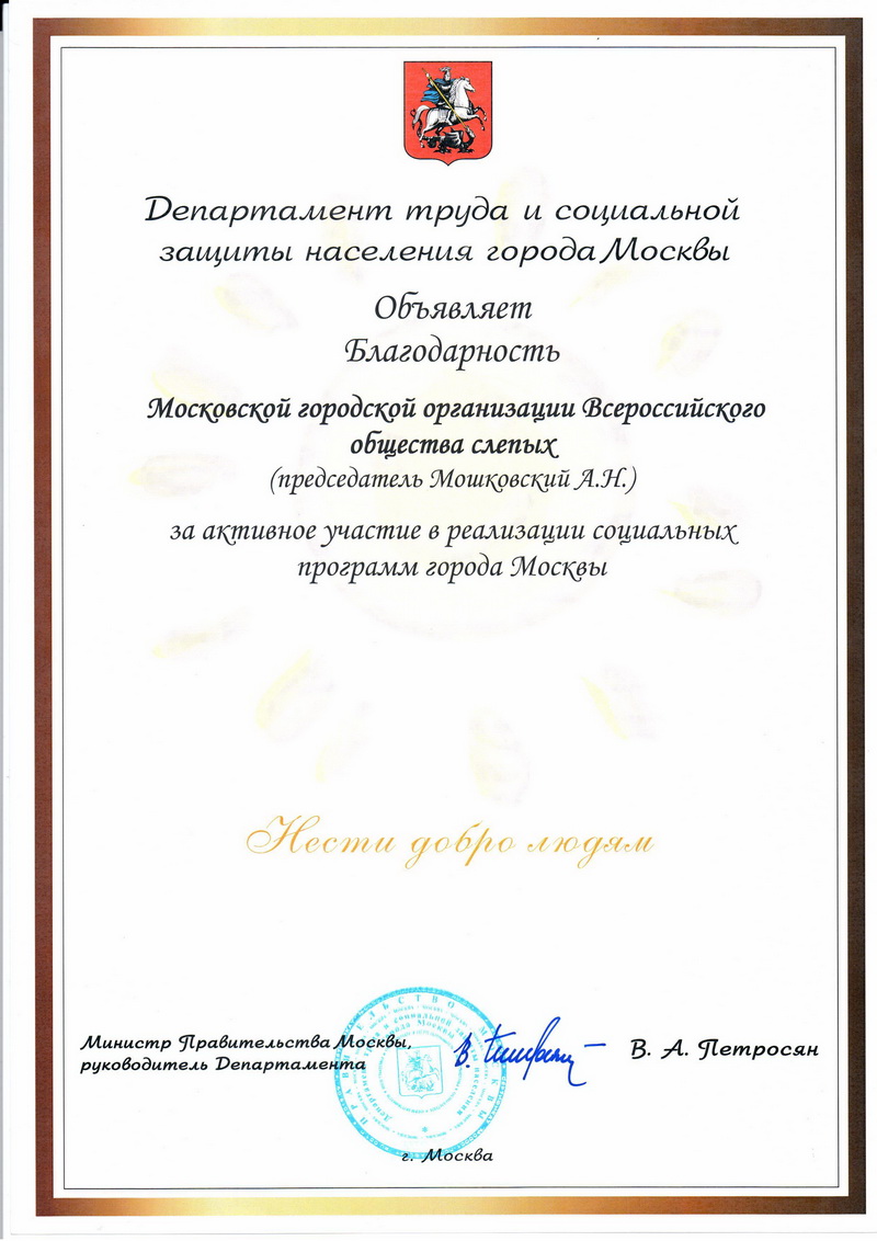 Московская городская организация ВОС благодарит ЦОМП за помощь незрячим людям и поздравляет с заслуженной победой!